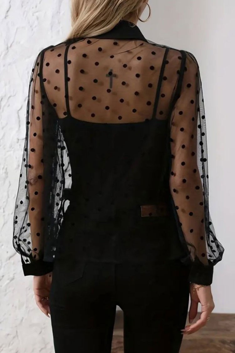 - Cămașa are mâneci lungi, închidere standard cu nasturi și material transparent, iar partea de sus are un design simplu de culoare neagră.