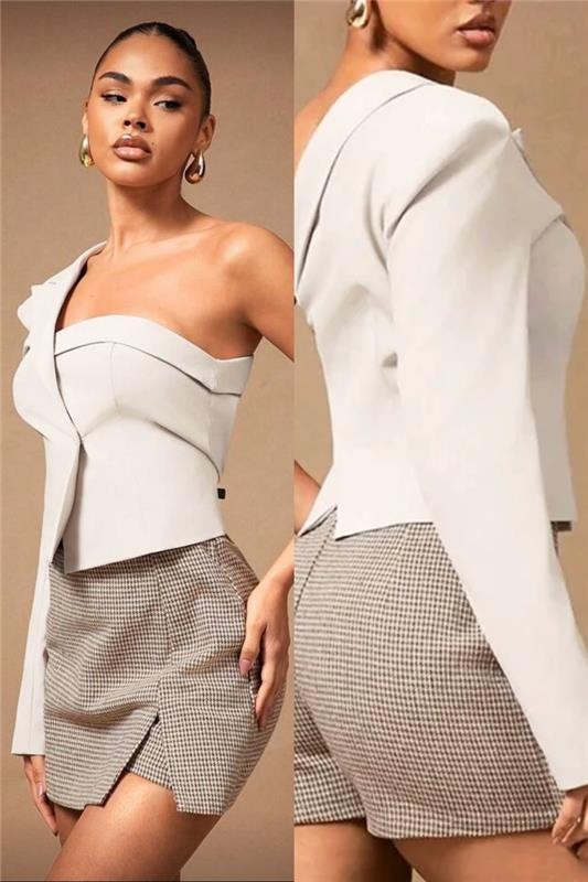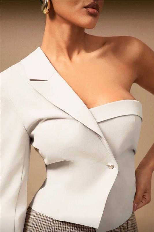 - Modelul are un design asimetric, un umăr și o linie curată a siluetei care accentuează figura.