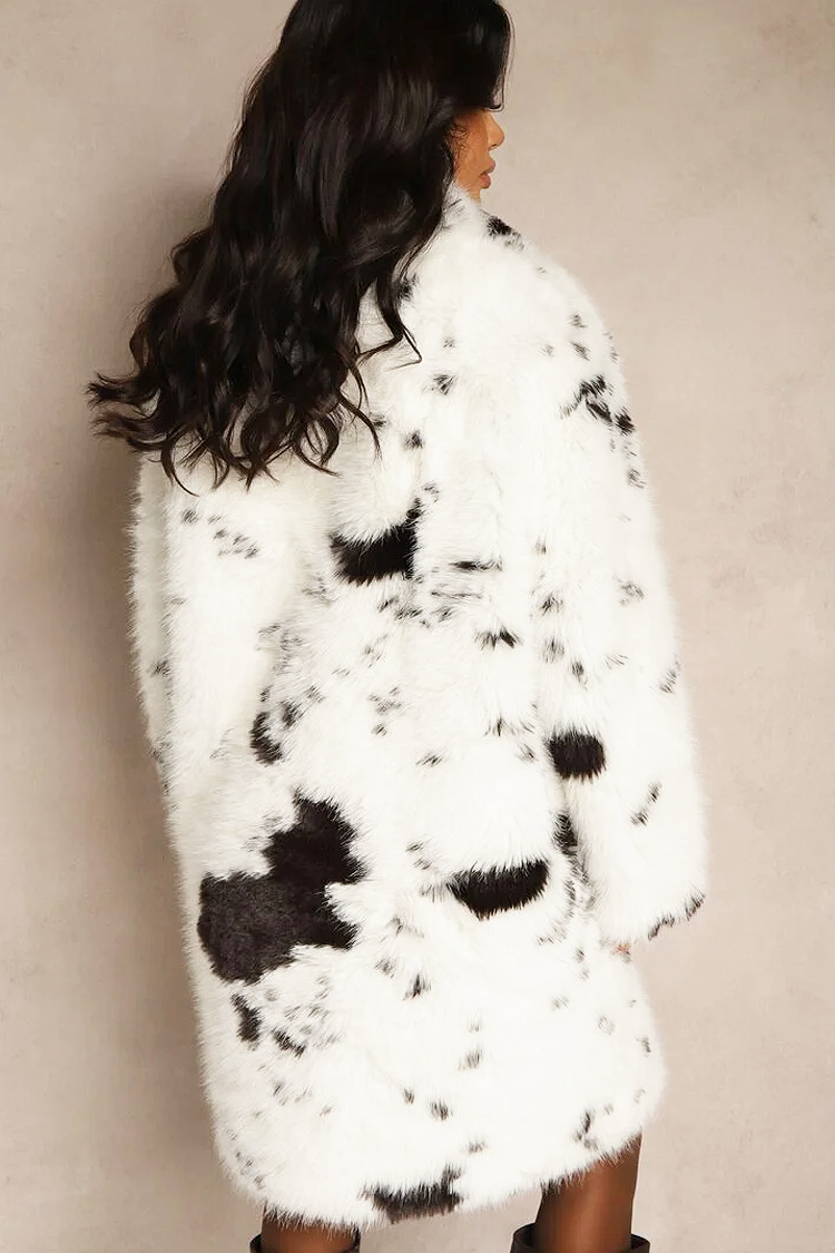 - Modelul are o lungime midi și o croială confortabilă, un guler voluminos și un imprimeu cu vacă.