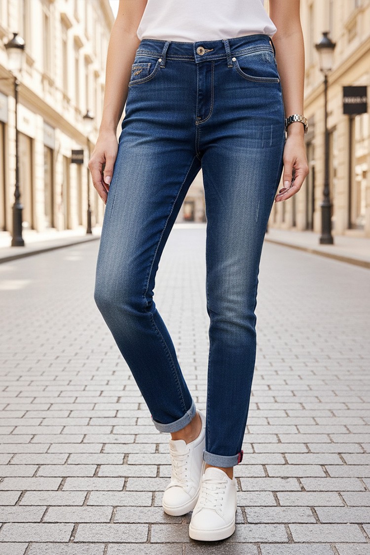 - Diversifică-ți garderoba cu un model practic de blugi albastru închis cu rupturi decorative, potriviți pentru viața de zi cu zi.
