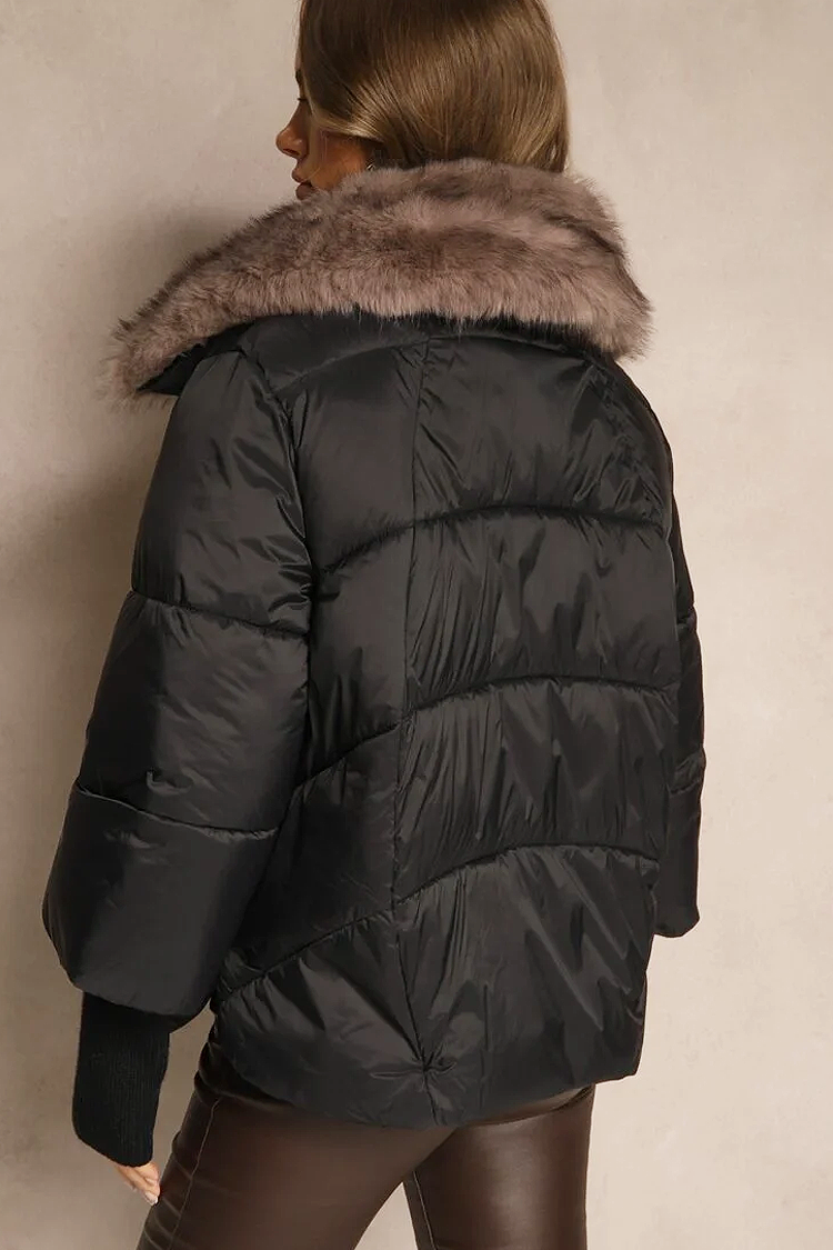 - Modelul are o croială confortabilă, închidere cu nasturi și fermoar, guler voluminos și puf pe toată lungimea.