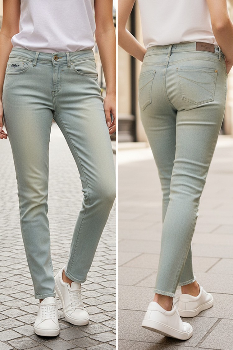 - Blugi de damă model basic, cu croială slim fit, de culoare albastru deschis, potriviți pentru viața de zi cu zi sau plimbări.