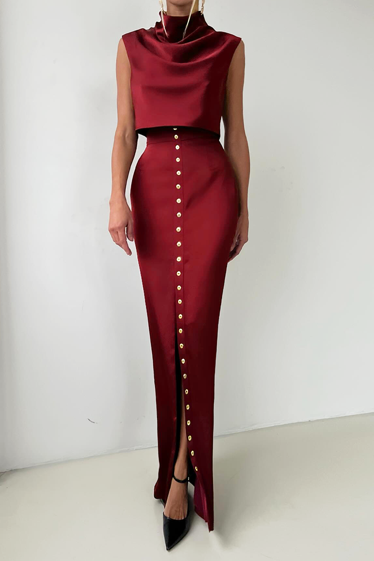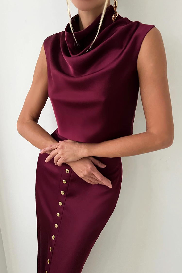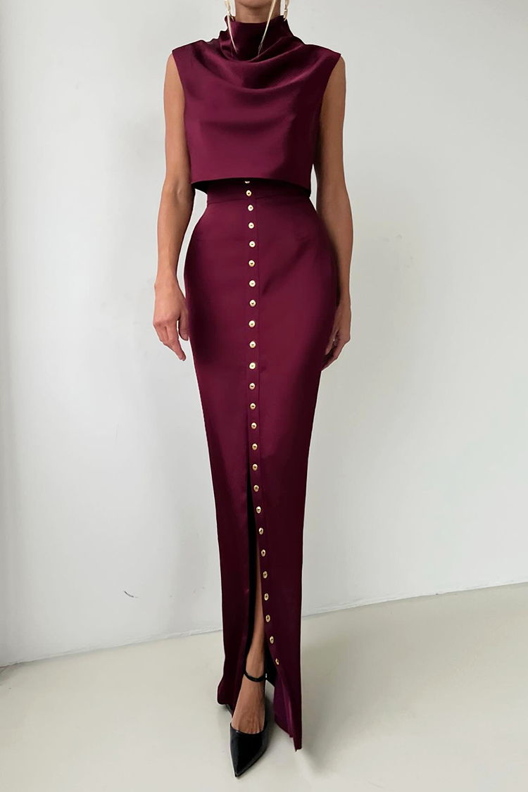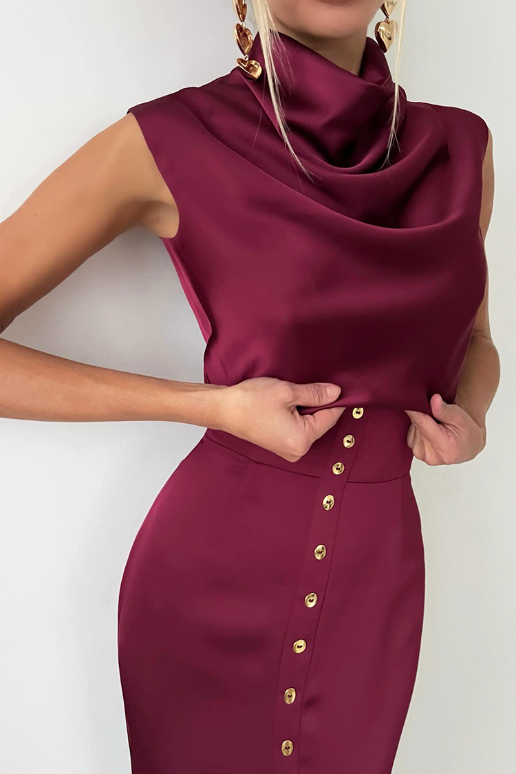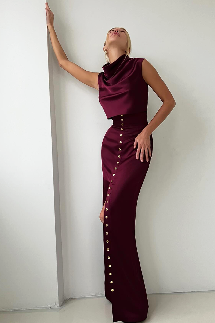 - Fusta are talie înaltă, croială dreaptă și nasturi pe lungime, ceea ce permite purtarea cu crăpături.