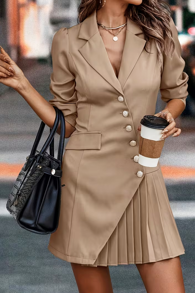 - Alege această rochie scurtă de culoare bej, potrivită pentru orice ocazie specială și ținute office.