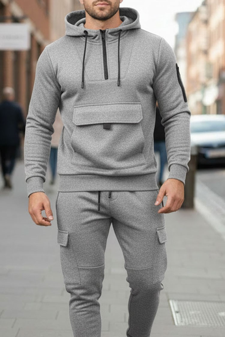 - Set pentru bărbăti confortabil, din două piese, de culoare gri, format dintr-un hanorac și pantaloni.