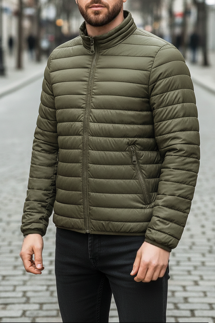 - Geacă pentru bărbăti confortabilă, cu design matlasat și buzunare, de culoarea khaki, cu un stil sport, de zi cu zi.