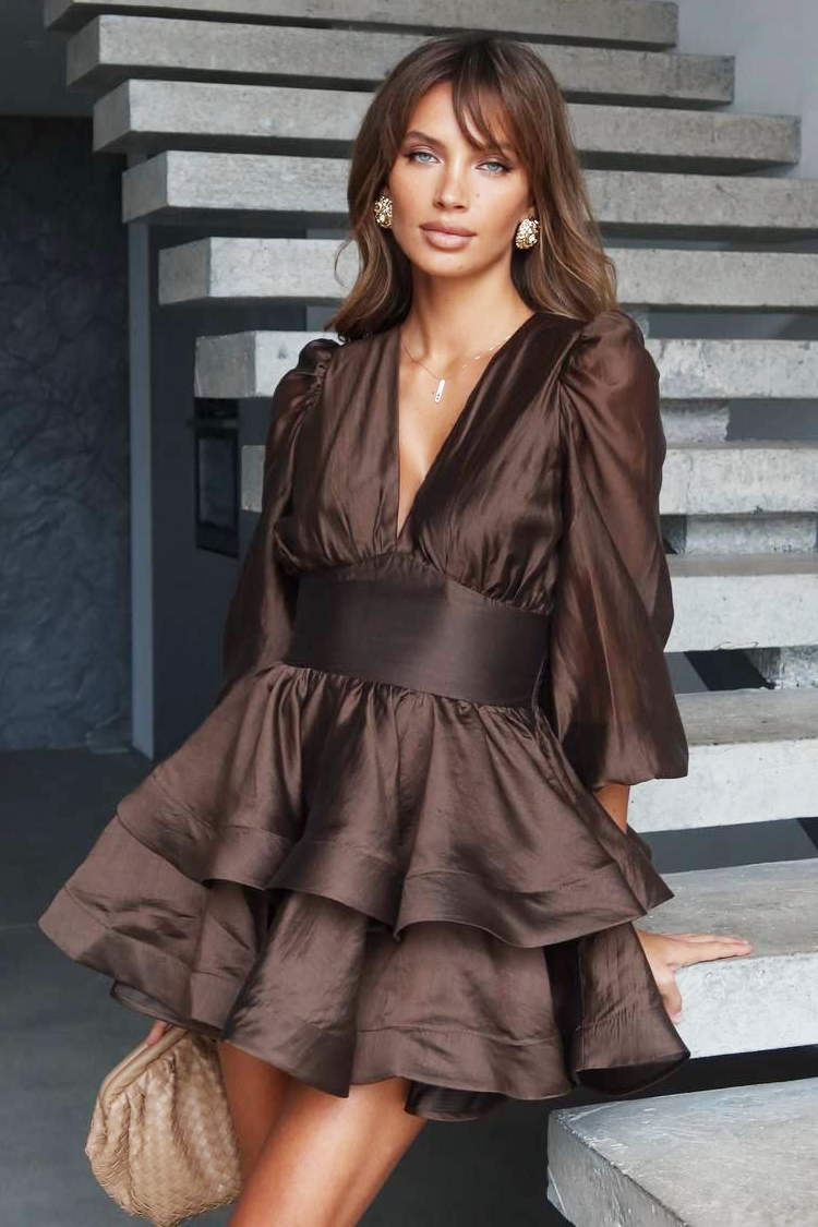 - Alege această rochie mini, de culoare maro, potrivită pentru orice ocazie specială și look de petrecere.