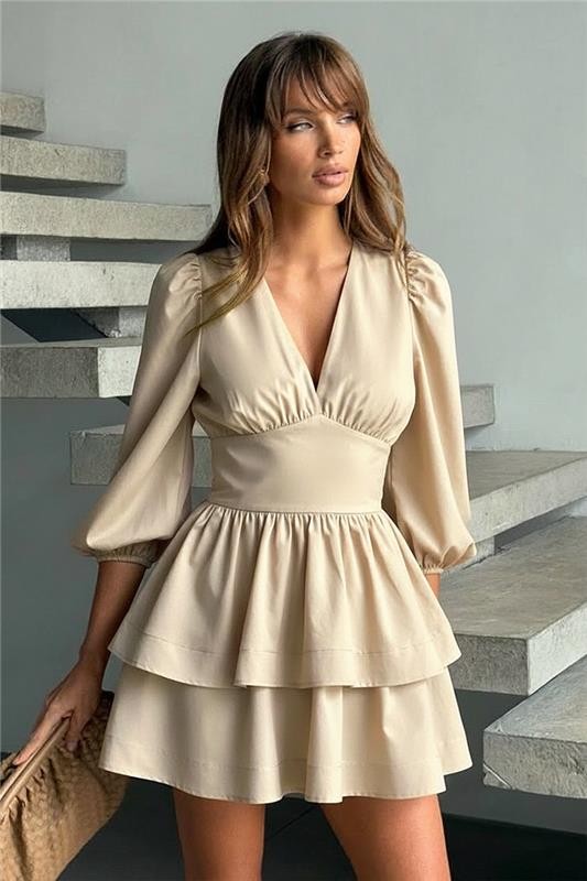 - Alege această rochie mini, de culoare bej, potrivită pentru orice ocazie specială și look de petrecere.