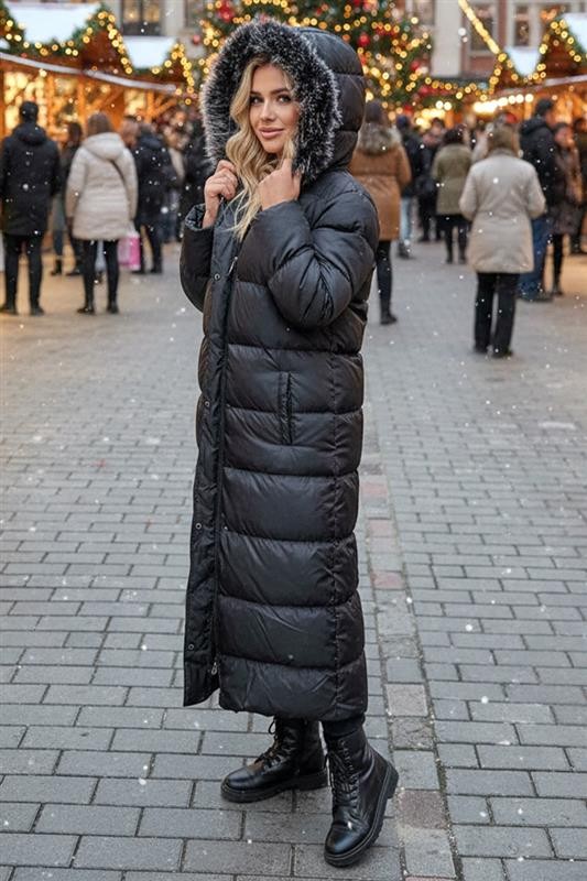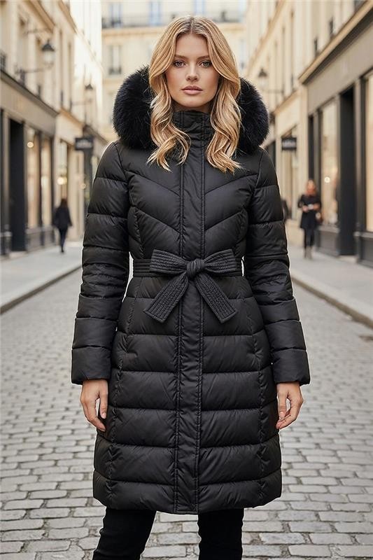 - Modelul are o croială lejeră, lungime lungă, buzunare practice și glugă cu puf.