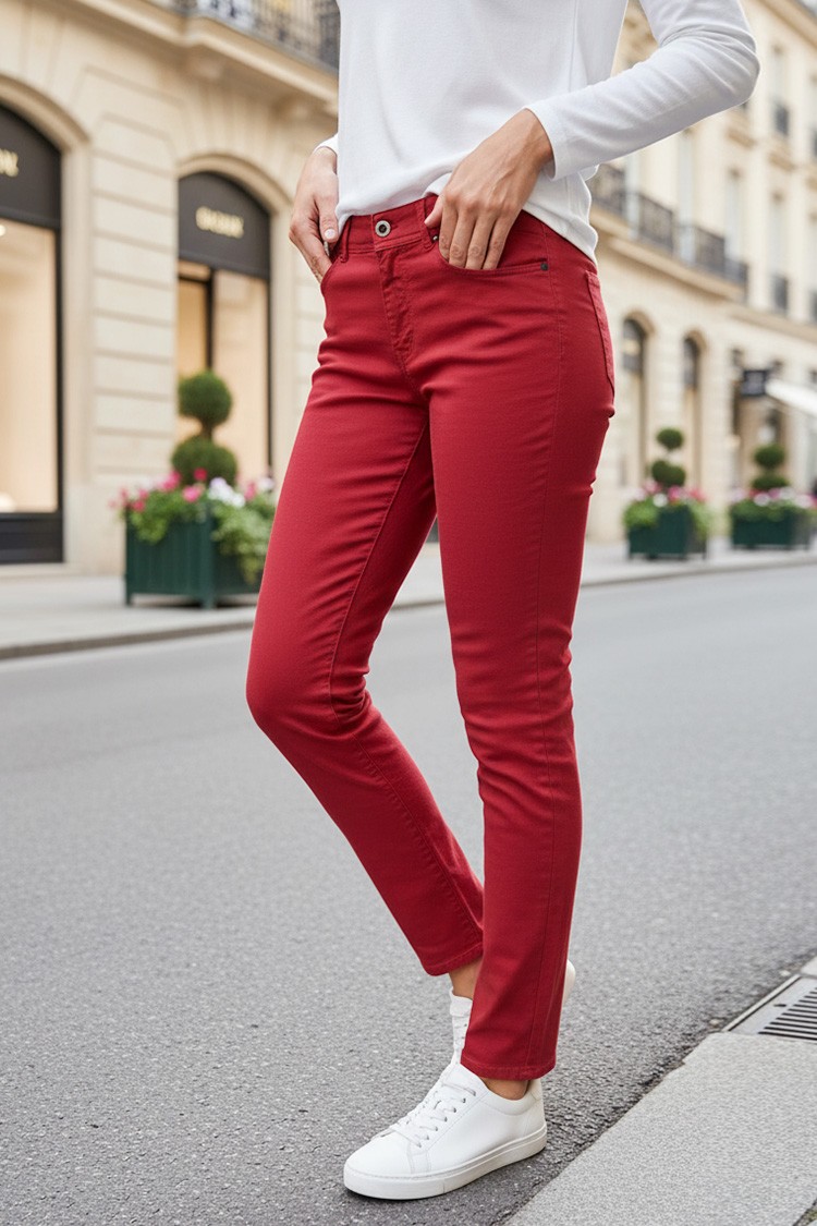 - Pantaloni eleganți de damă, cu talie standard și croială dreaptă, de culoare visiniu.