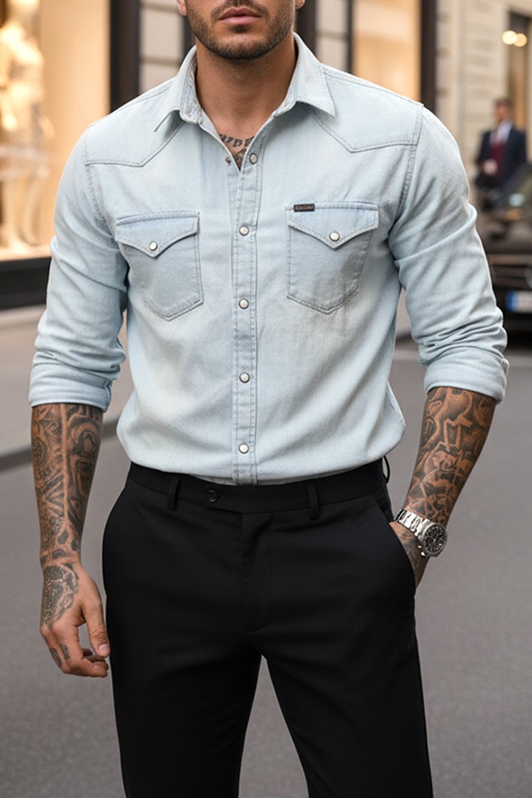 - Cămașă practică pentru bărbați, cu un design basic, buzunare cu clapă și nasturi, potrivită pentru diverse combinații vestimentare.