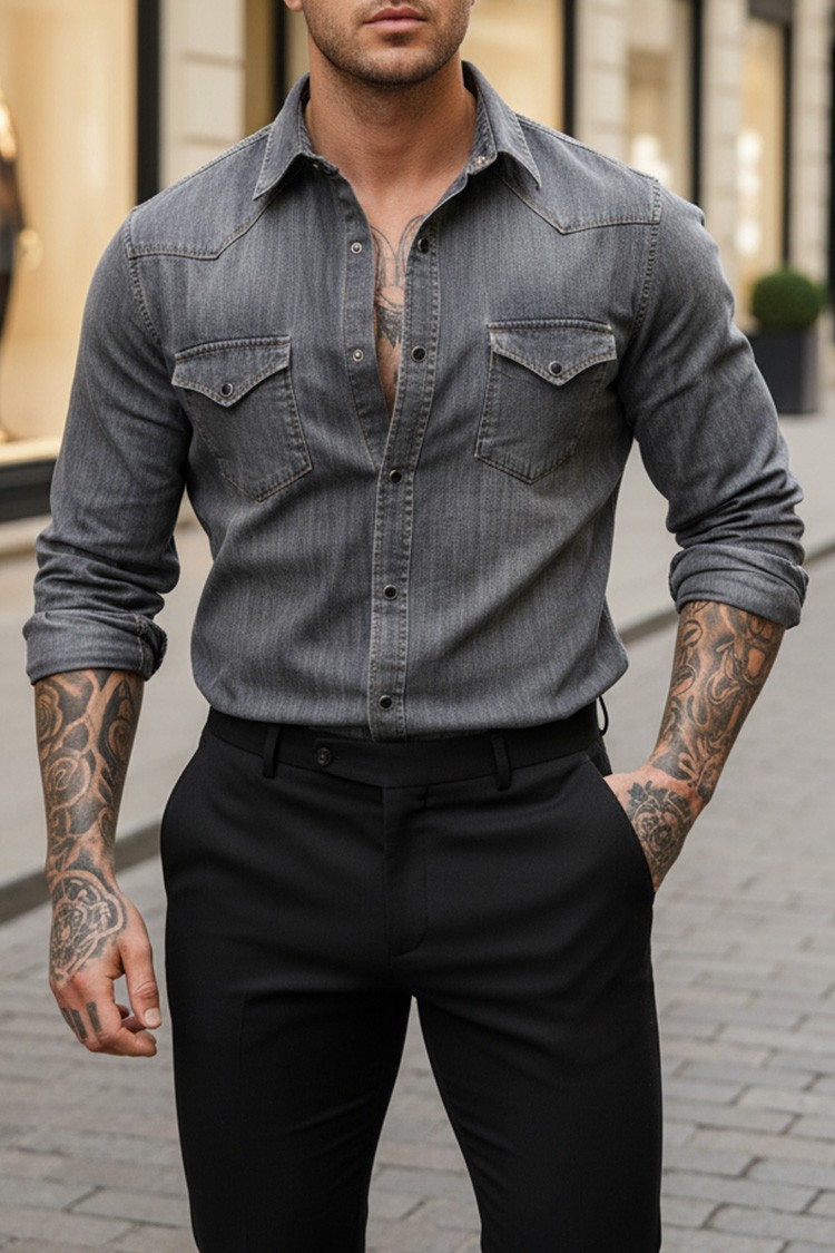 - Cămașă practică pentru bărbați, cu un design basic, buzunare cu clapă și nasturi, potrivită pentru diverse combinații vestimentare.