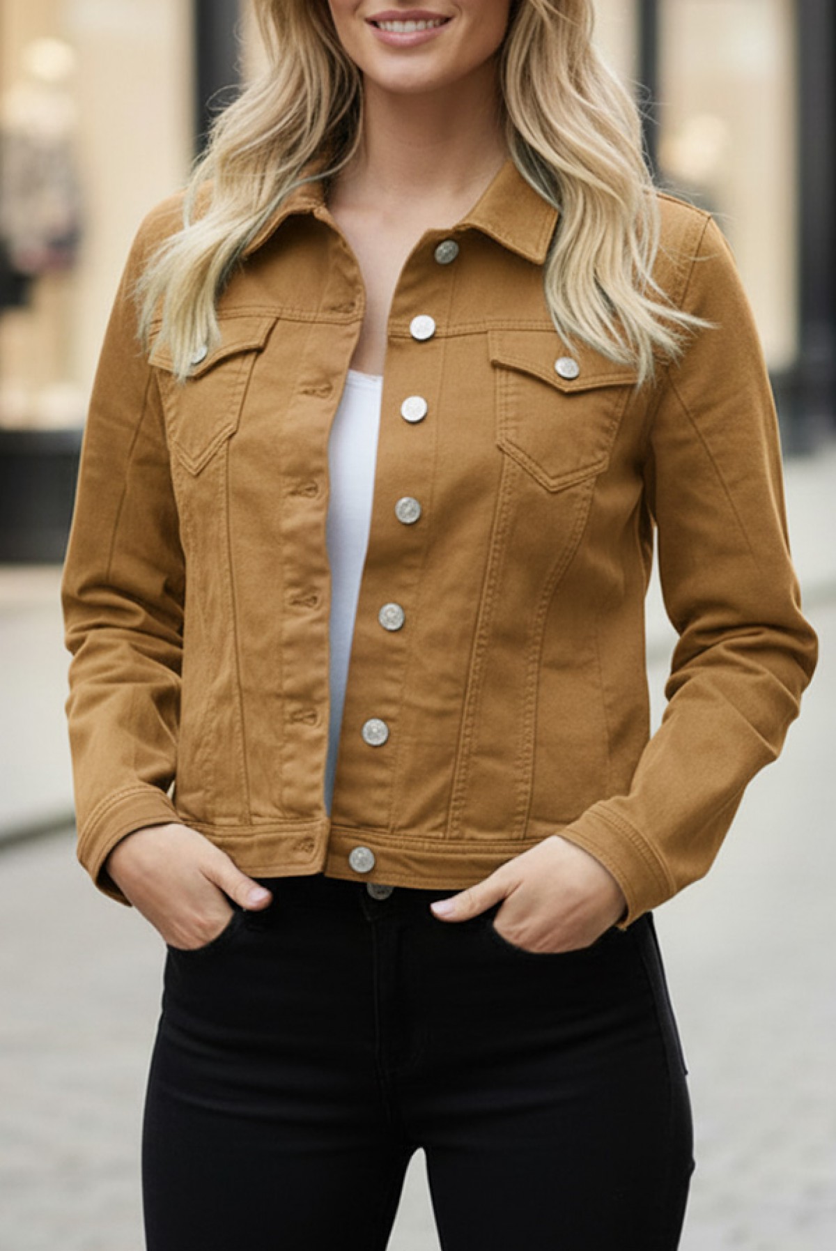 - Geacă modernă de dama, de culoare maro deschis, potrivită pentru diverse combinații de modă.