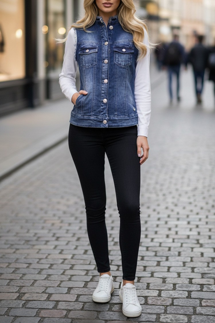 - Vestă modernă de dama din denim, de culoare bleumarin, cu efect decolorat, potrivită pentru diverse combinații de modă.