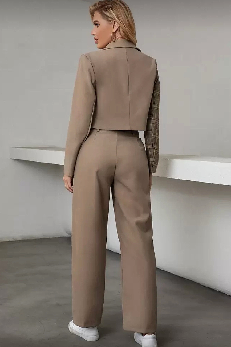 - Pantalonii au talie înaltă și picioare late, iar sacou are o croială scurtă și un model atractiv.