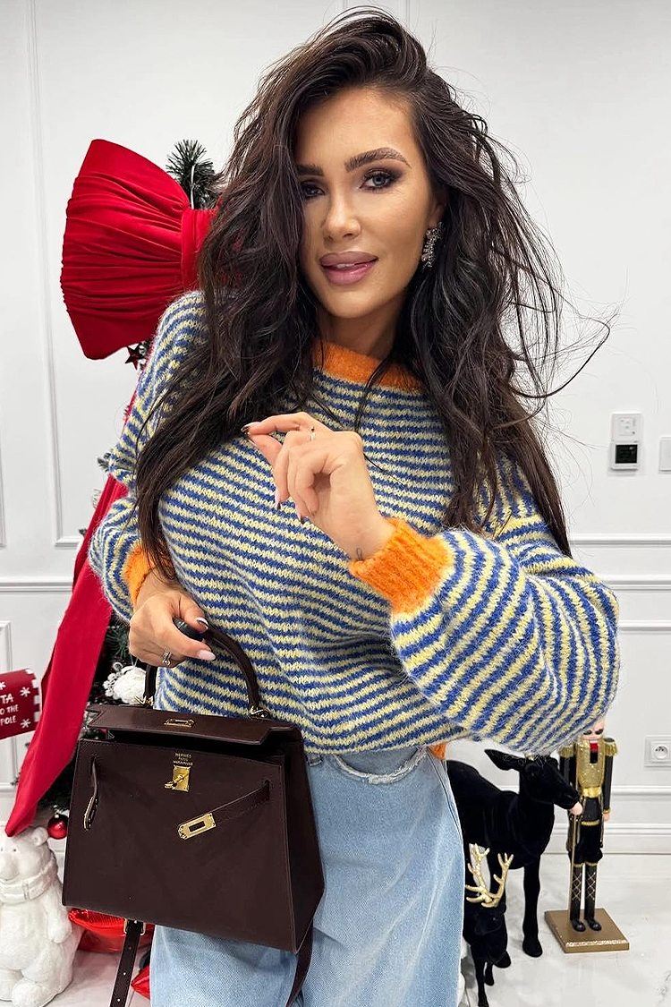 - Pulover practic cu model multicolor, potrivit pentru diverse ținute de iarnă.