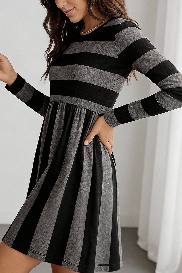 - Pentru ținuta ta de zi cu zi, alege această rochie scurtă cu model în dungi.