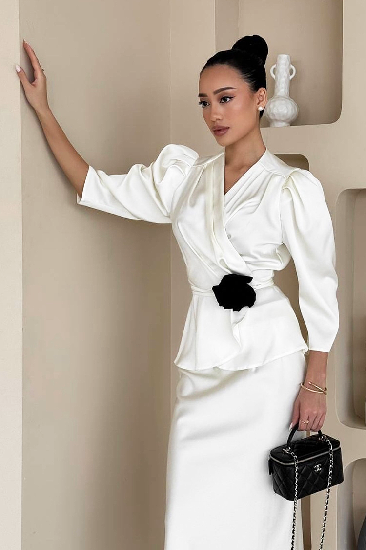 - Cămașa are o croială elegantă, mâneci bufante și un trandafir negru atractiv, iar fusta are un design mulat și lungime midi.