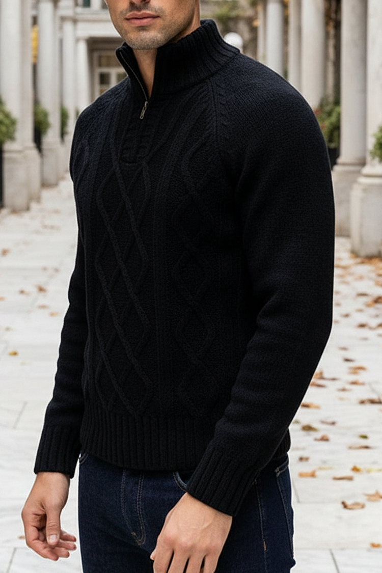 - Pulover pentru bărbăti călduros, cu fermoar și motive în relief, de culoare neagra, potrivit pentru diverse combinații vestimentare.