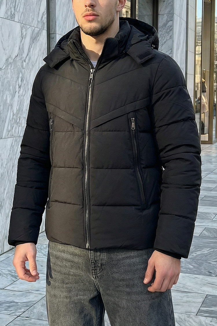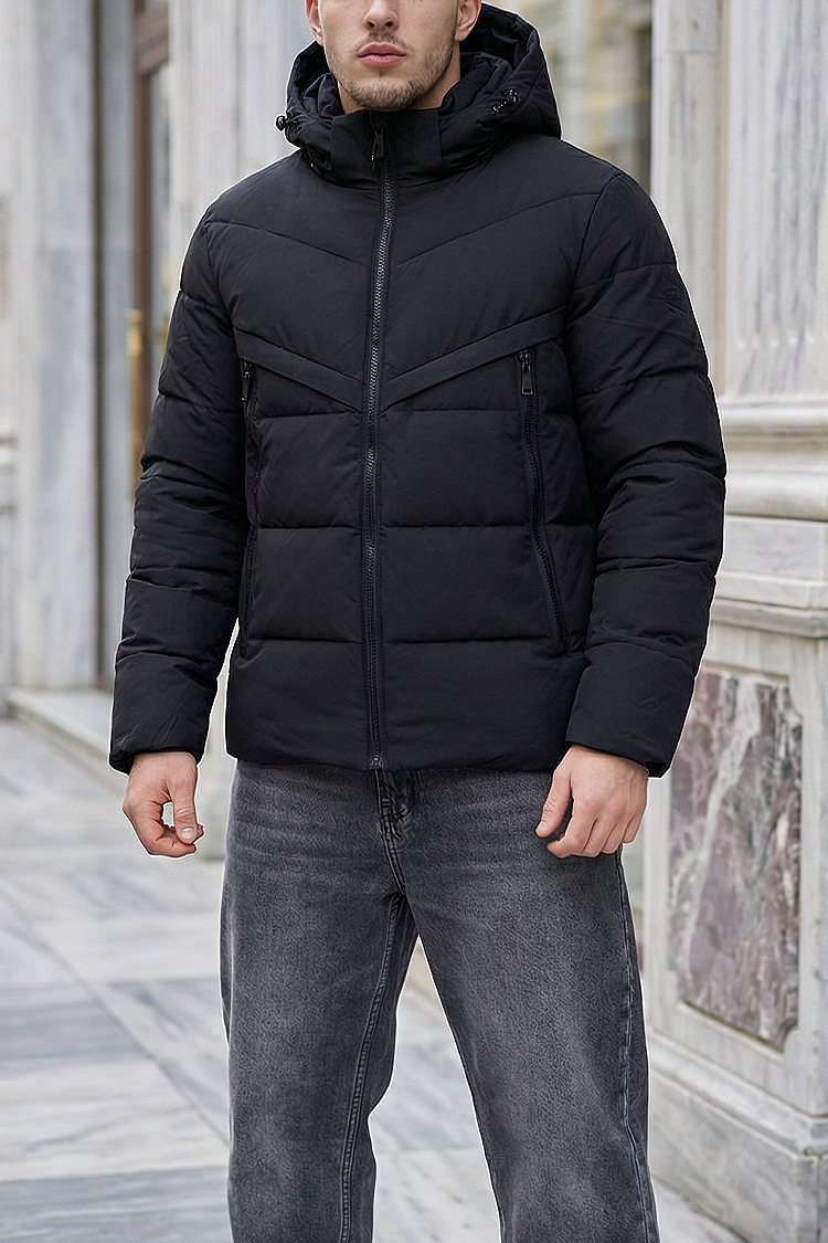 - Geaca practică pentru bărbați, cu căptușeală călduroasă, cu protecție pentru gât și glugă fixă, de culoare neagră.