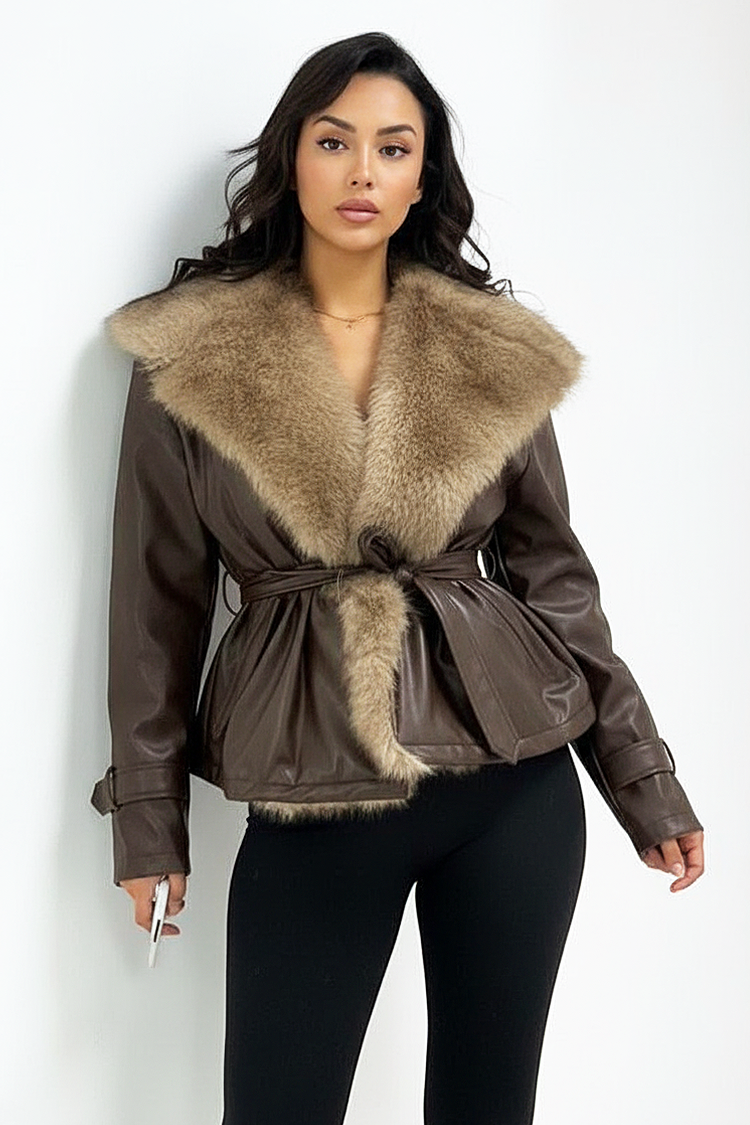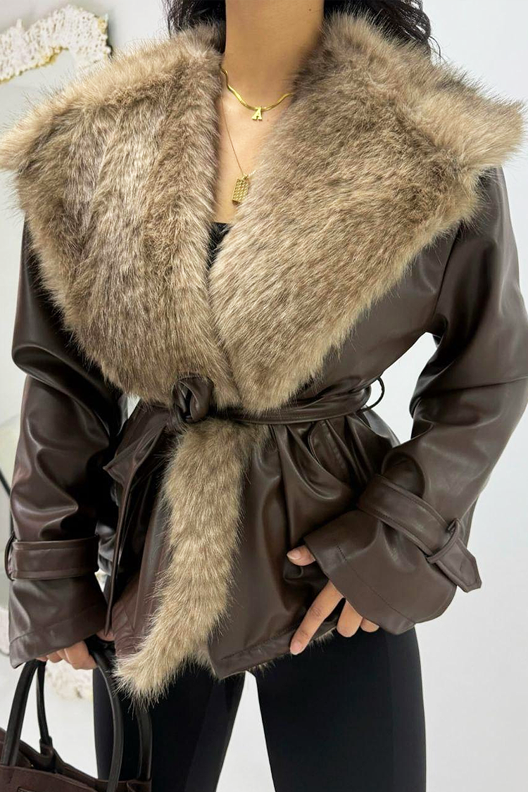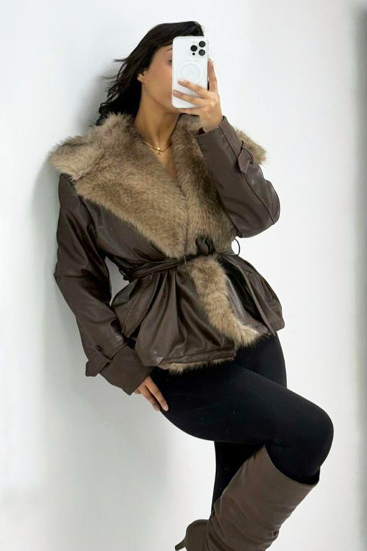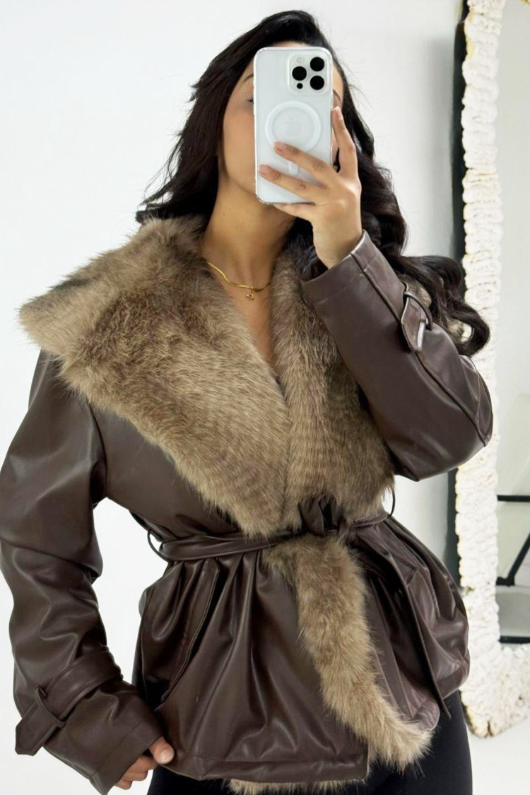 - Modelul este confecționat din piele ecologică, are guler voluminos cu blană, de culoare maro și o curea din același material textil.