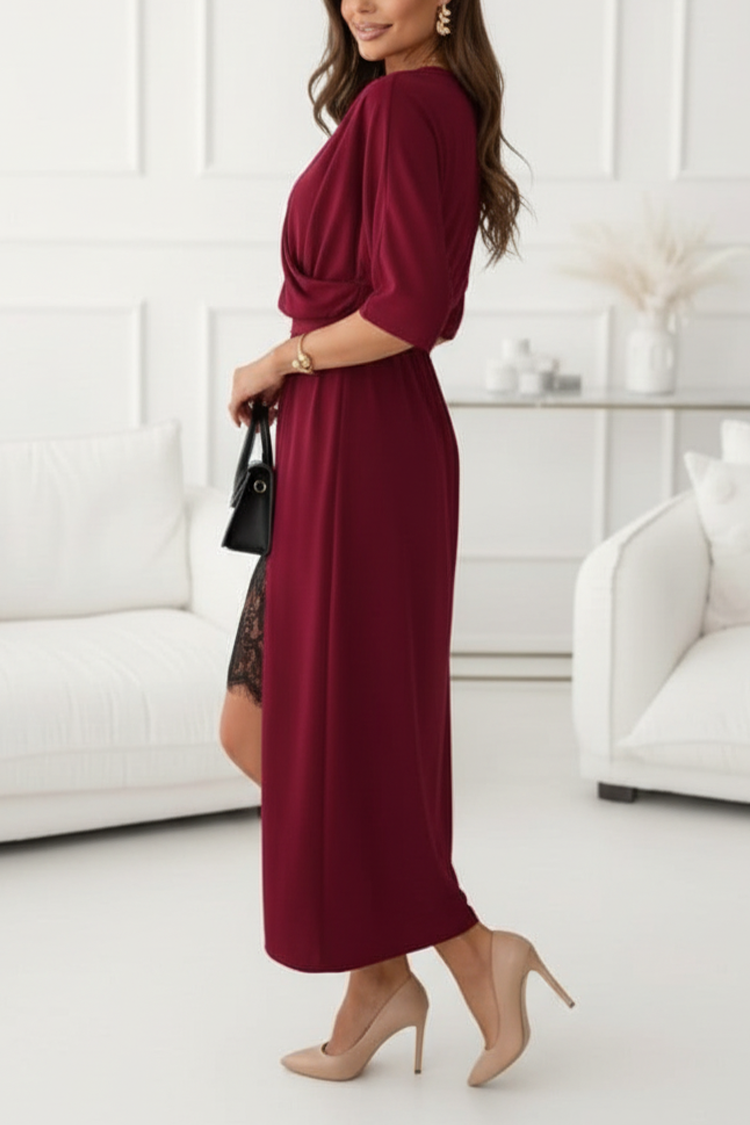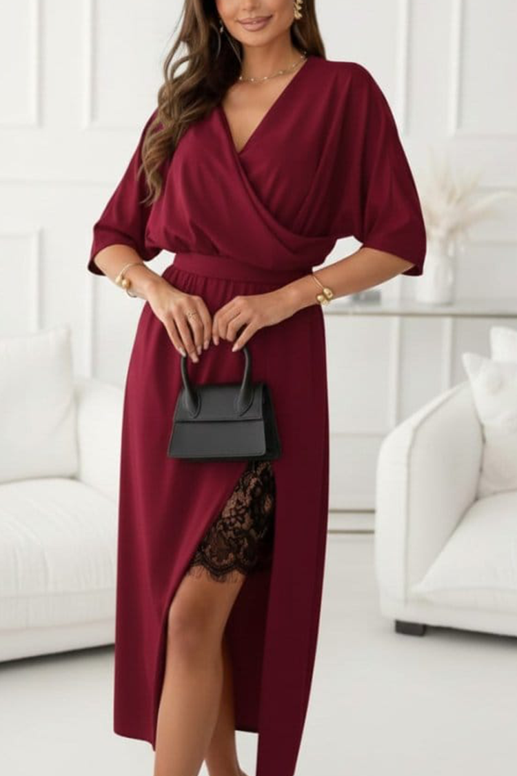 - Modelul are lungime midi, dantelă sexy, crăpătură, mâneci scurte și decolteu V.