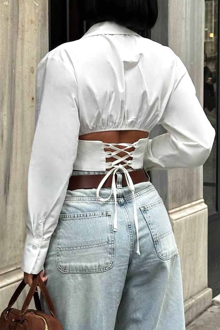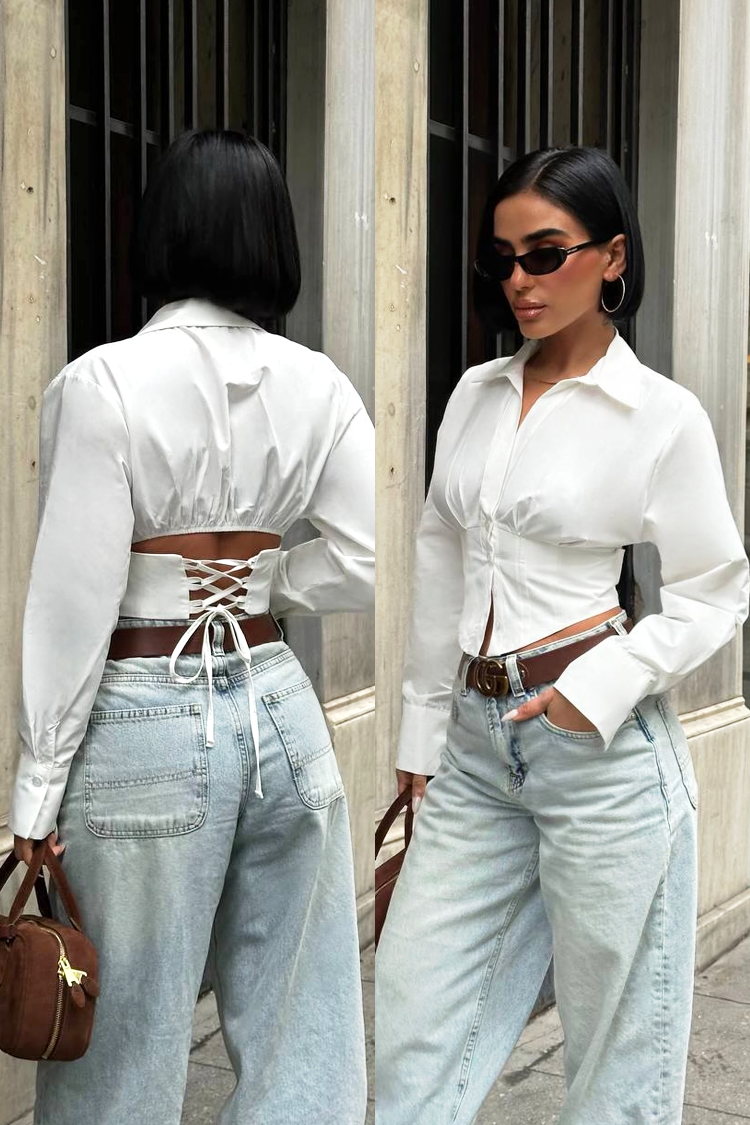 - Modelul are o croială mulată și se leagă cu legături în talie, la spate.