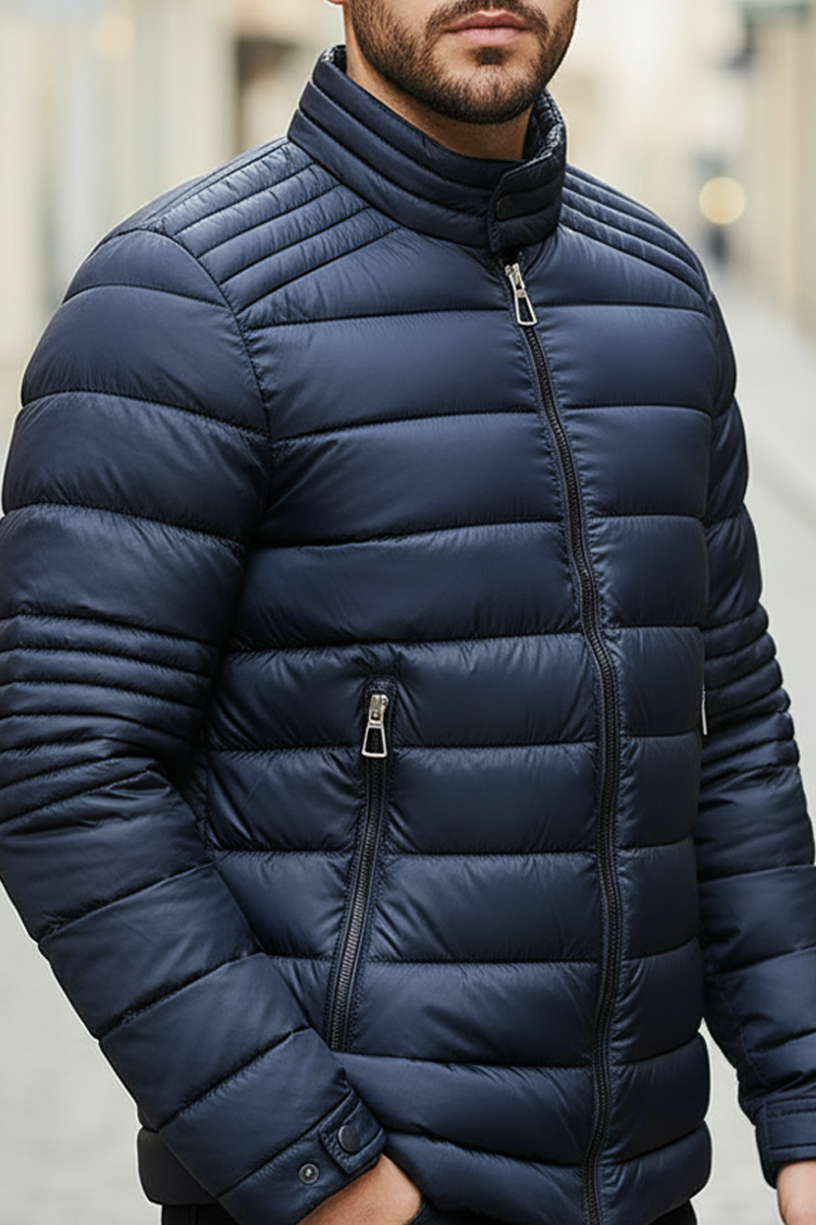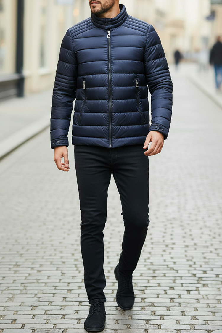 - Geacă pentru bărbăti confortabilă, cu design matlasat și guler semi-polo cu nasture tip biciuire, de culoare neagră, cu un stil sport de zi cu zi.