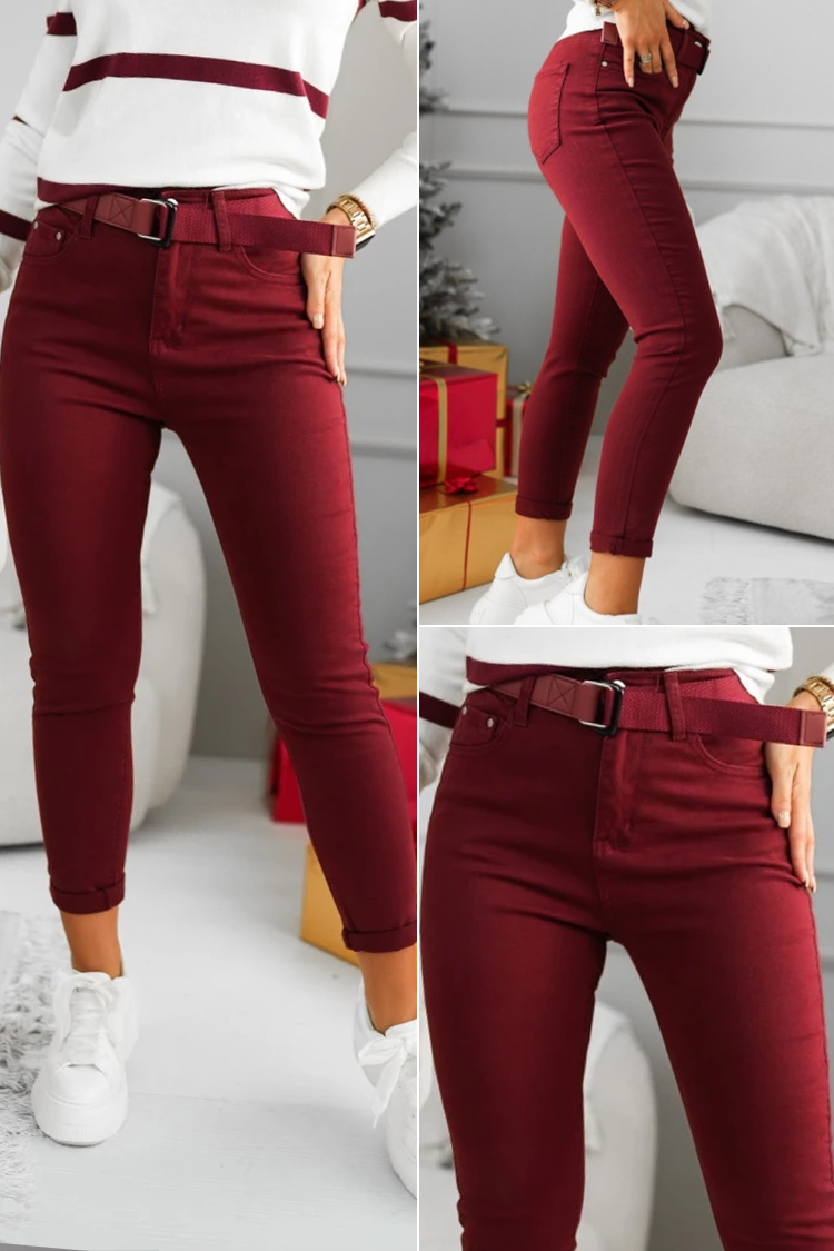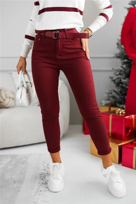 - Model elegant de blugi de damă, de culoare visiniu, potriviți pentru viața de zi cu zi sau pentru o plimbare.