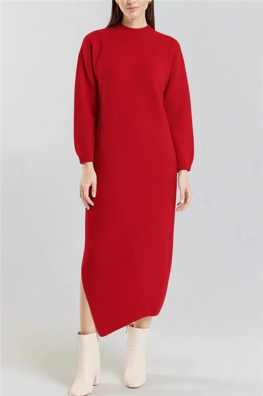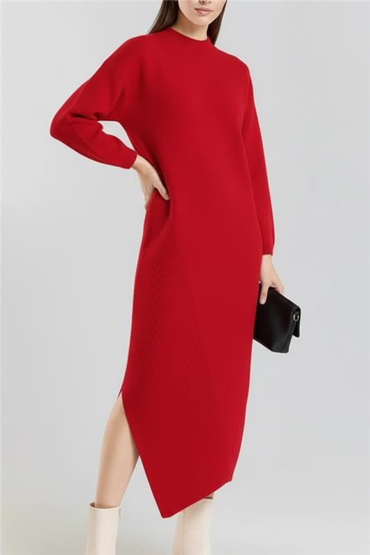 - Modelul are o croială confortabilă, mâneci lungi, lungime midi și o crăpătură pe o parte.