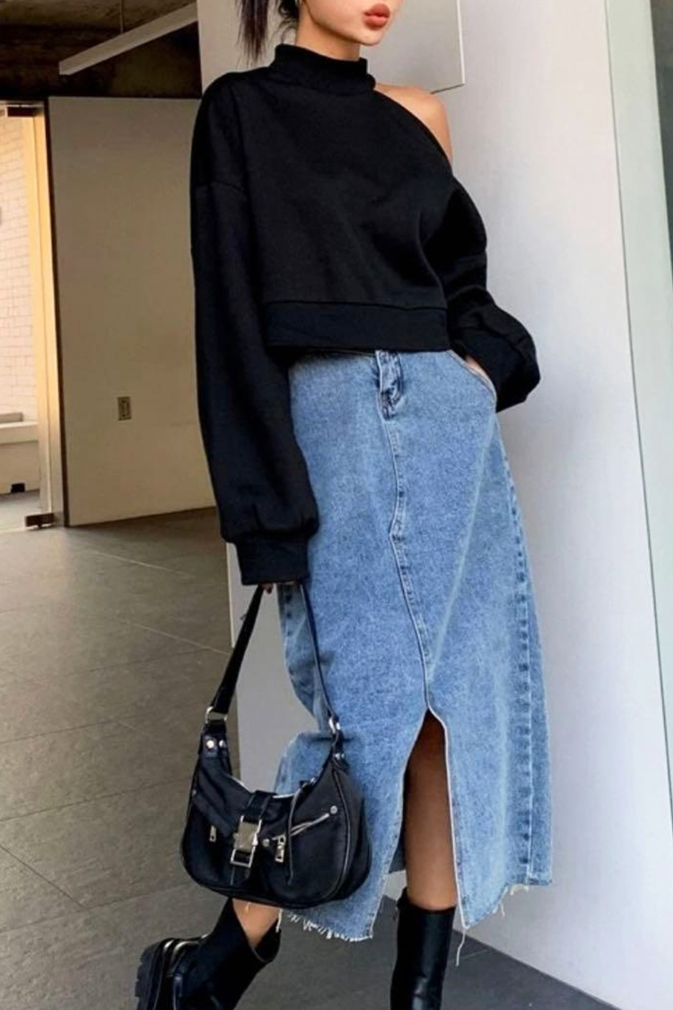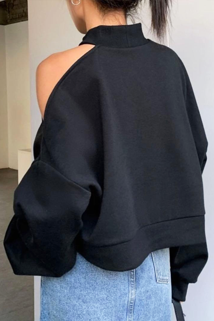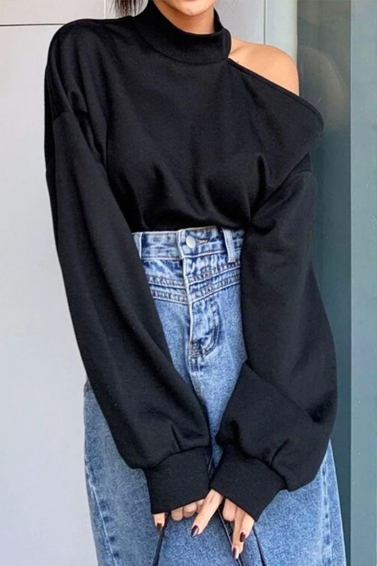 - Modelul are mâneci lungi și o croială confortabilă, culoare neagră și umeri deschiși.