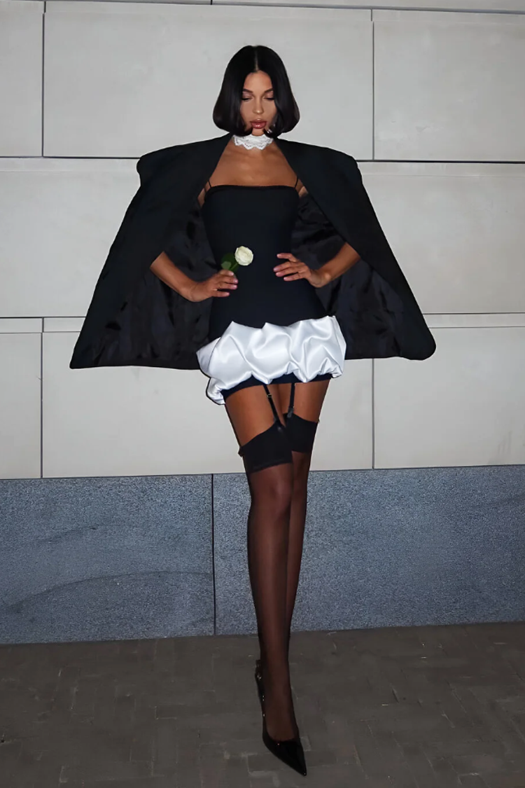 - Modelul are o croială mulată, bretele subțiri, lungime scurtă și detalii satinate.