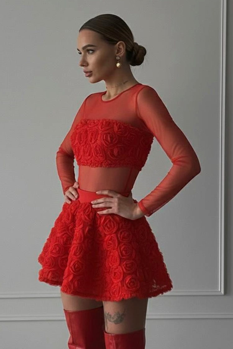 - Body - bluză cu mâneci lungi, tul și trandafiri decorativi, combinată cu o fustă scurtă cu accente elegante.