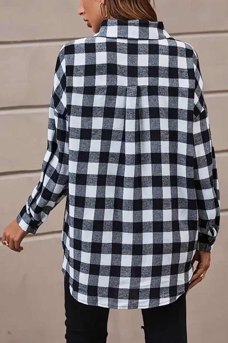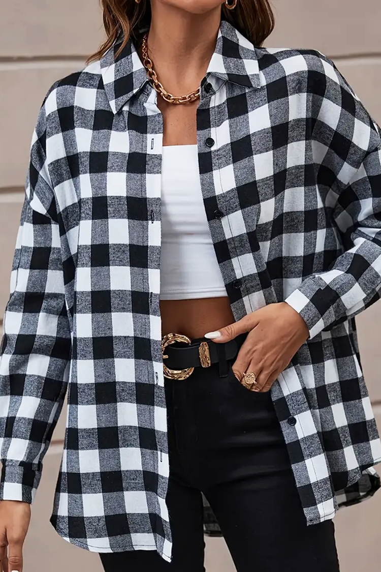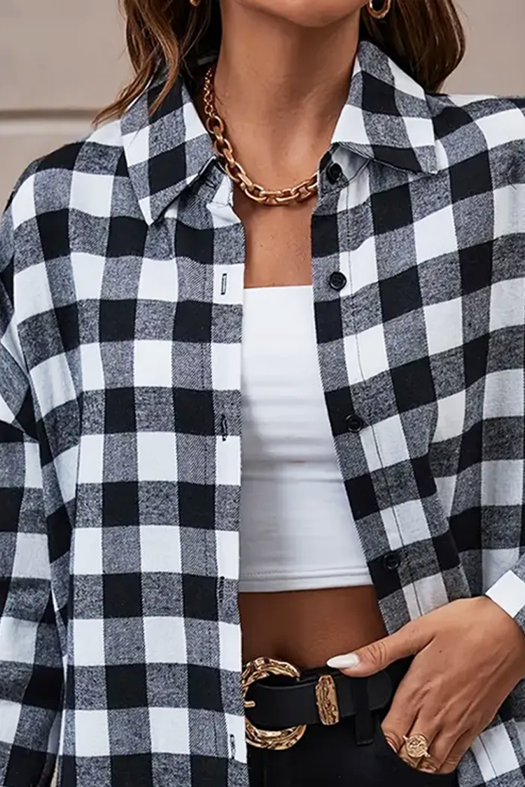 - Modelul are un design în carouri, închidere standard cu nasturi și o croială clasică.