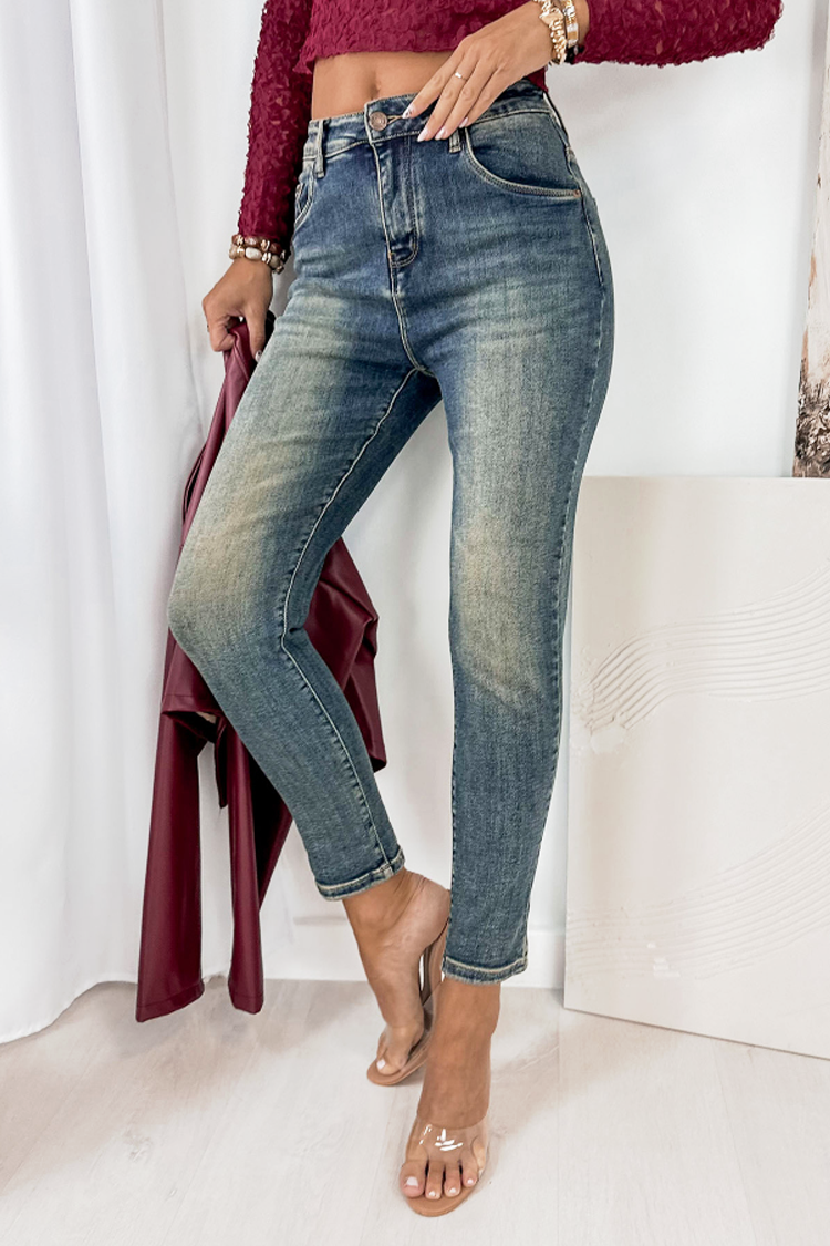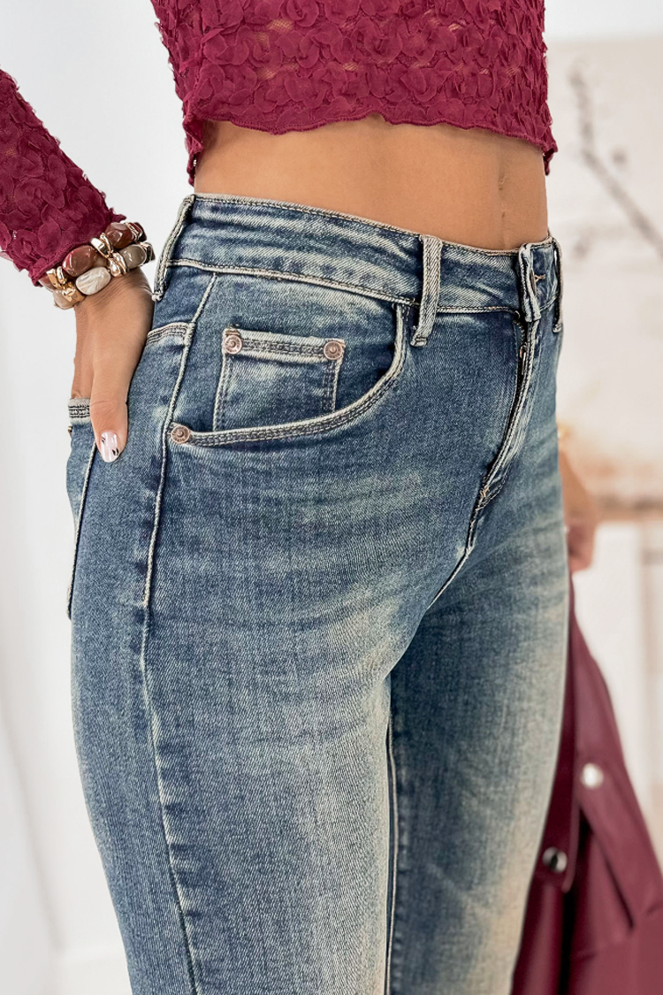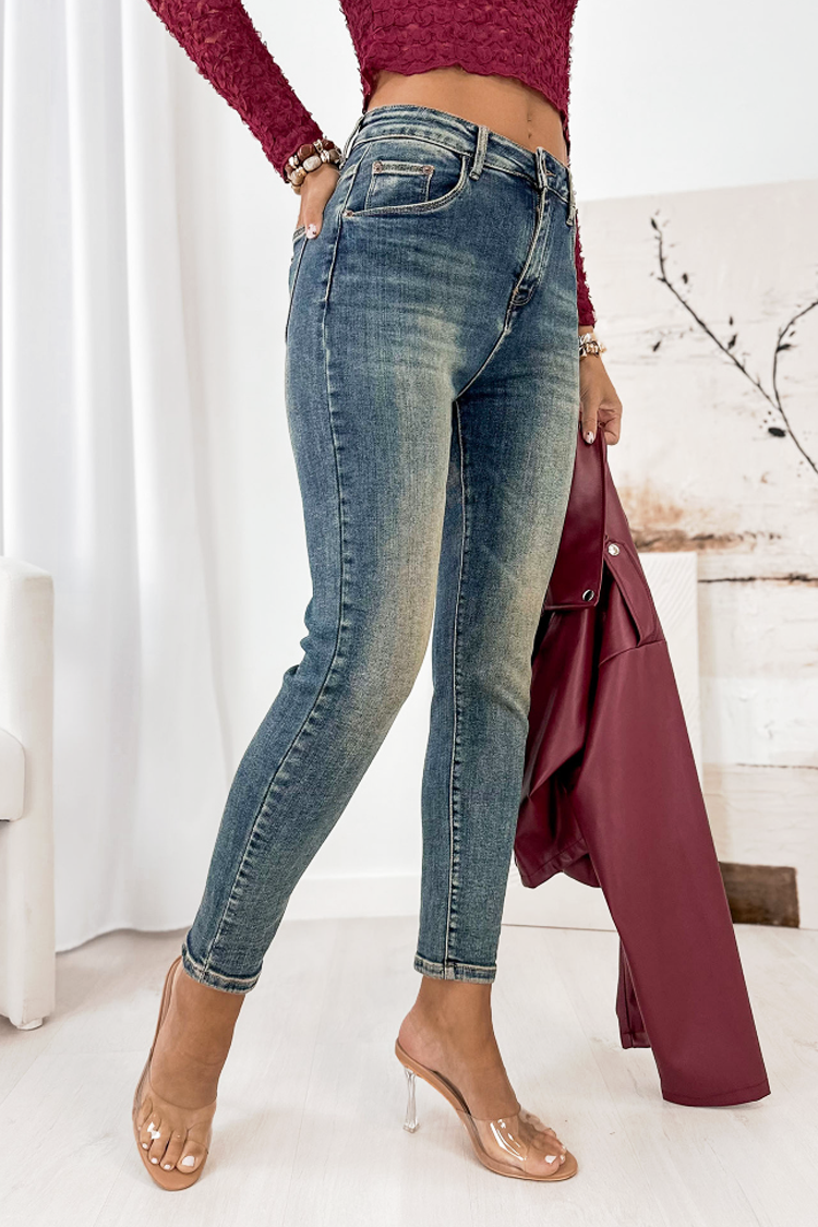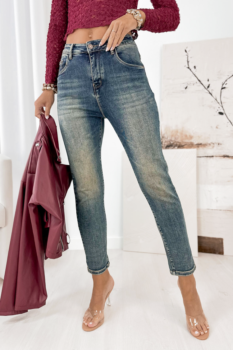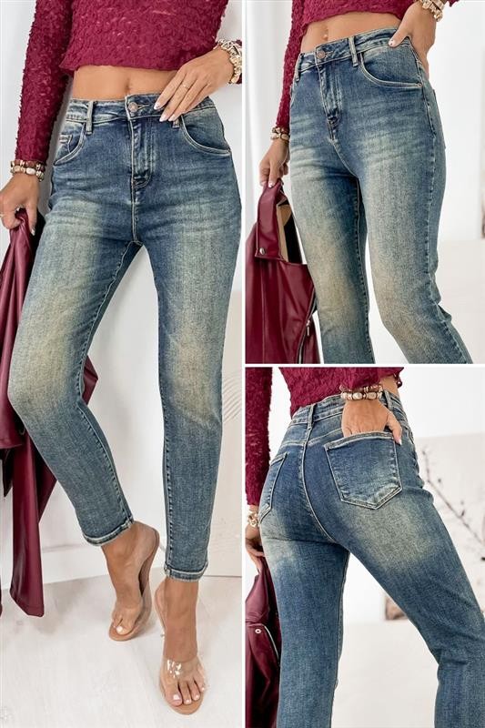 - Model basic blugi de damă, de culoare albastru deschis, cu efect decolorat, potriviți pentru viața de zi cu zi sau pentru plimbări.