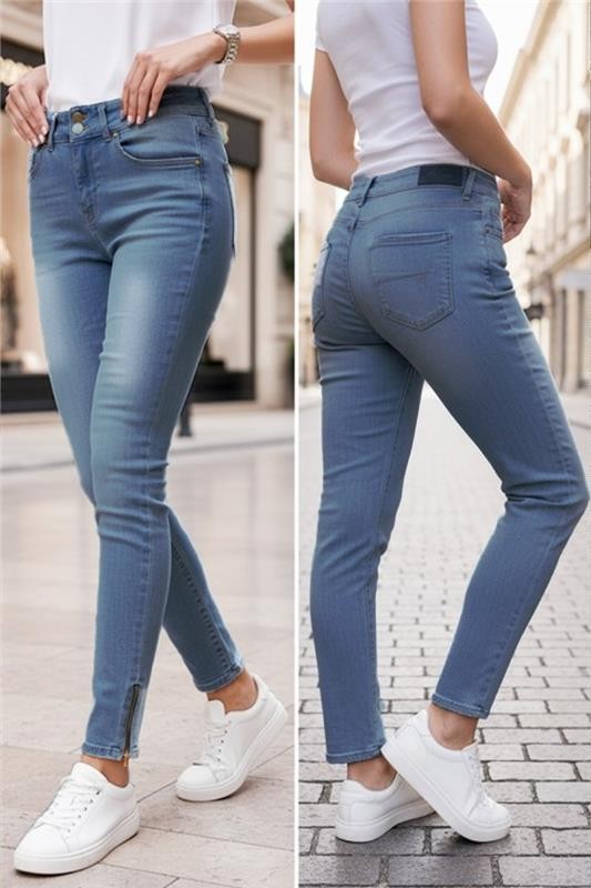 - Diversifică-ți garderoba cu o pereche practică de blugi albastru deschis, cu efect decolorat și fermoar la capătul picioarelor.