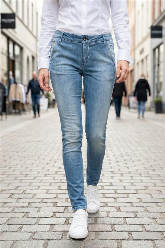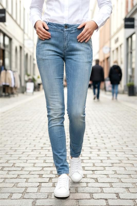 - Model basic de blugi de damă, de culoare albastru deschis, cu efect decolorat, potriviți pentru viața de zi cu zi sau pentru plimbări.