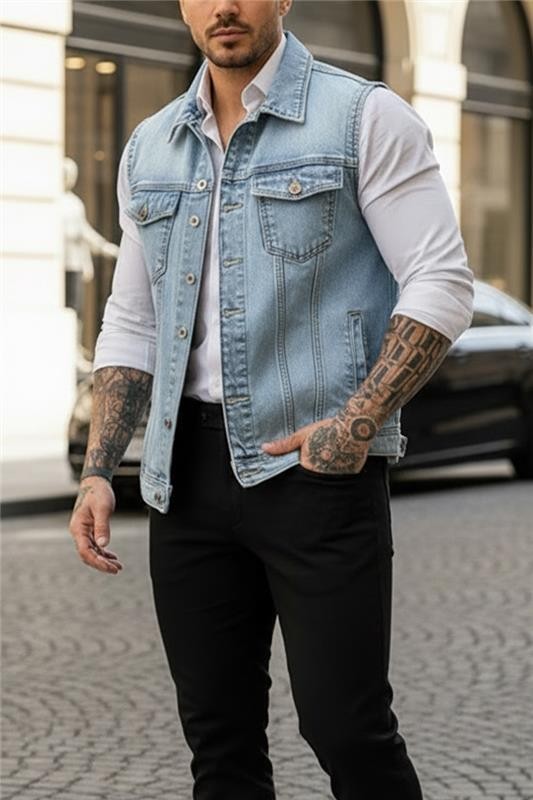 - Vestă pentru bărbăti practică, cu o croială lejeră, de culoare albastru deschis, potrivită pentru diverse combinații vestimentare.