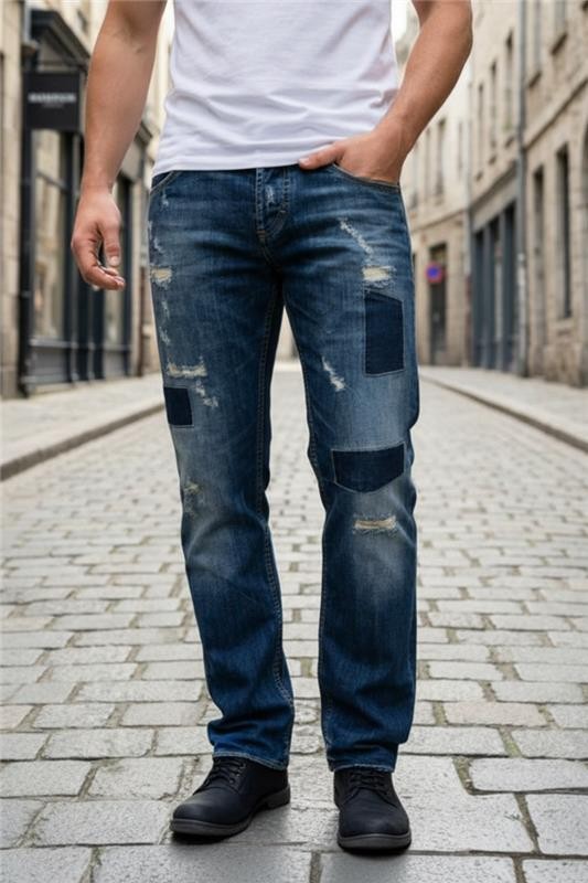- Model practic de blugi cu rupturi decorative și abraziuni pe picioare, potriviți pentru viața de zi cu zi. S