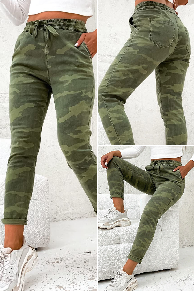 - Modelul are talie înaltă și elastică cu legături, buzunare laterale, croială mulată și model de camuflaj.
