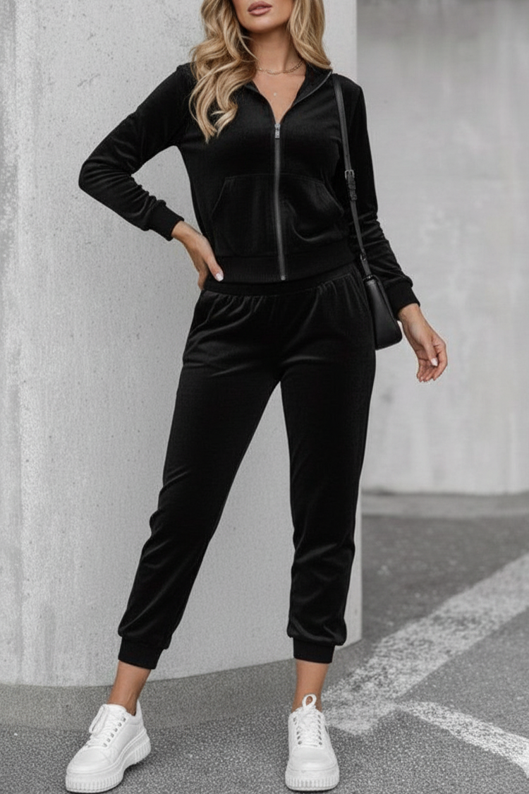 - Hanoracul are fermoar și glugă, iar pantalonii au talie înaltă și buzunare laterale.