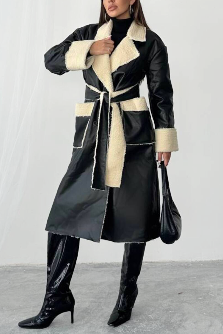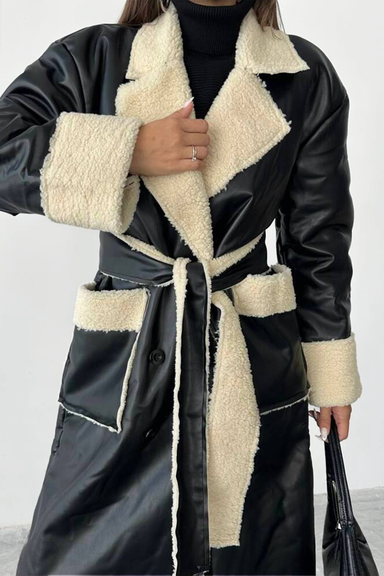 - Modelul are o croială clasică, guler elegant, curea, buzunare laterale și detalii cu puf.