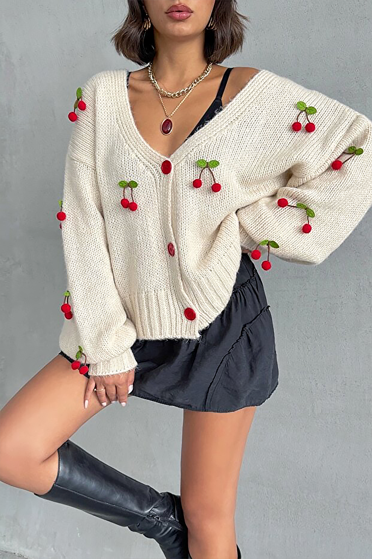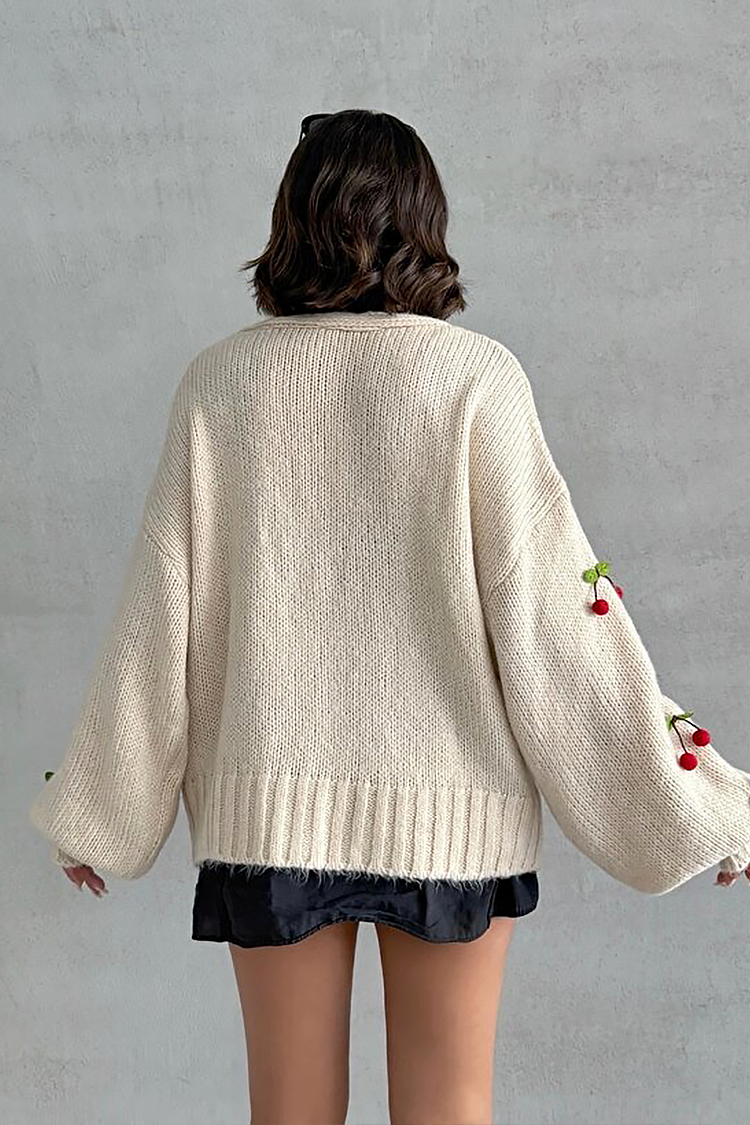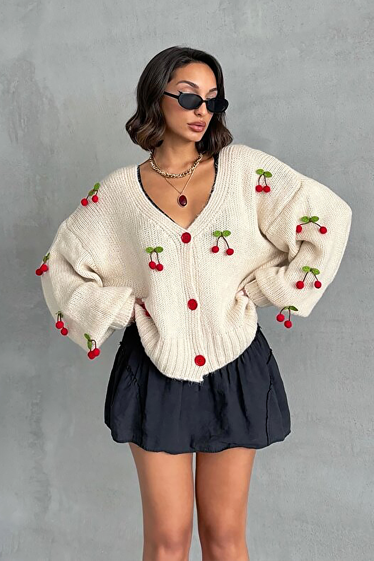 - Modelul are o croială oversize, nasturi roșii, design confortabil și decorațiuni cu cireșe pe toată lungimea.