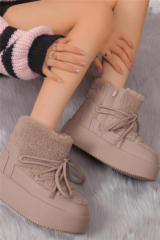 - Apreschiuri calde de dama confecționate din țesătură impermeabilă, decorate cu blană ecologică pufoasă de culoare mocca.