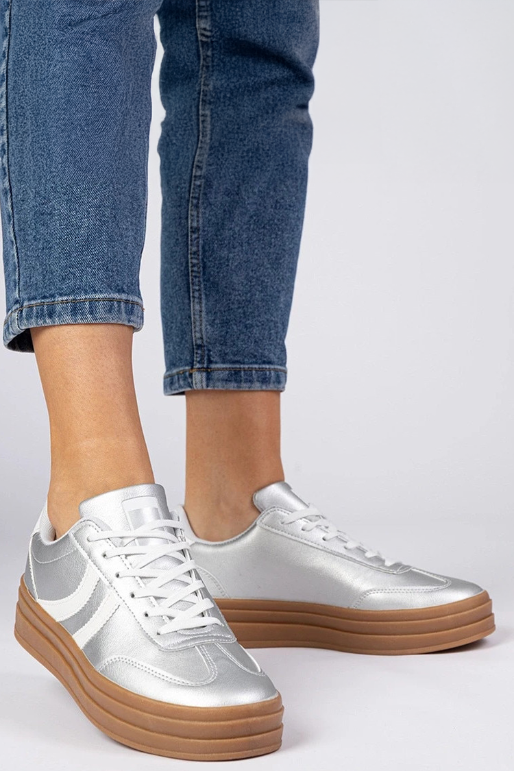 - Teniși de damă din piele ecologică de culoare argintie, cu șireturi și platformă, potriviți pentru viata de zi cu zi.