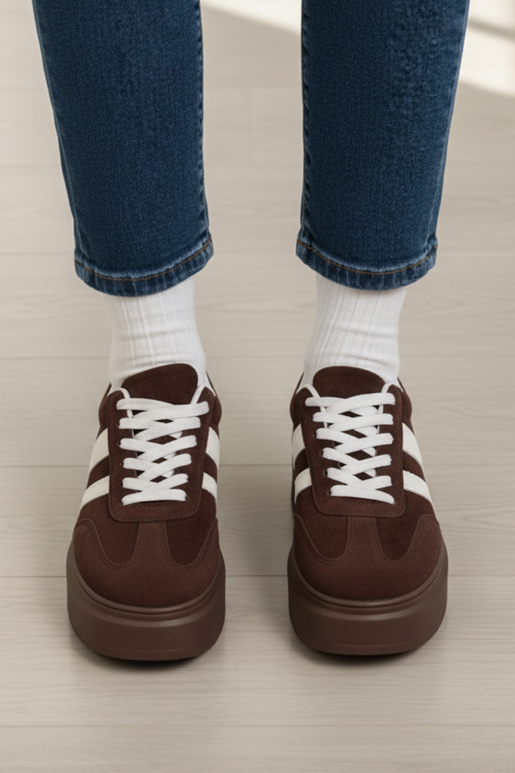 - Adidași de damă din piele ecologică, de culoare maro, cu șireturi și platformă, potriviți pentru viața de zi cu zi.