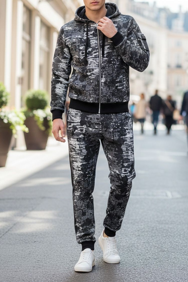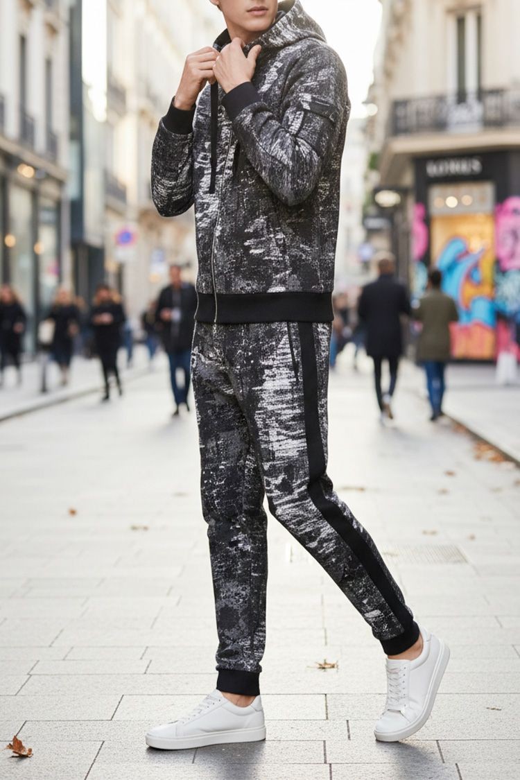 - Set pentru bărbăti confortabil, format din două piese, cu un model atipic, format dintr-un hanorac și pantaloni.