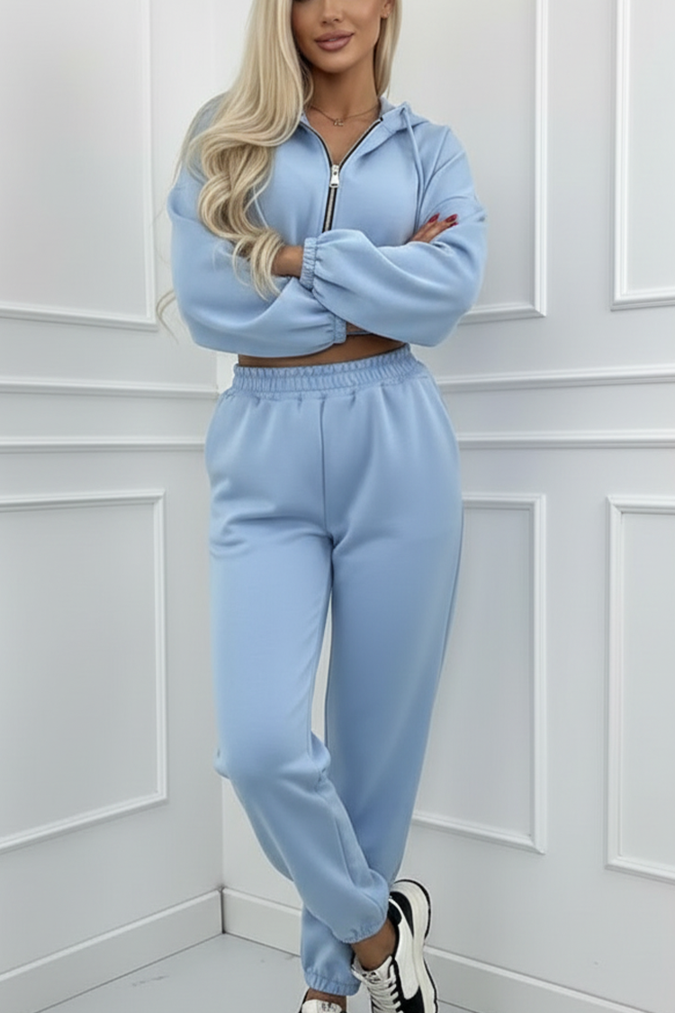 - Hanoracul are fermoar și glugă practică, iar pantalonii au talie înaltă, elastică și buzunare.