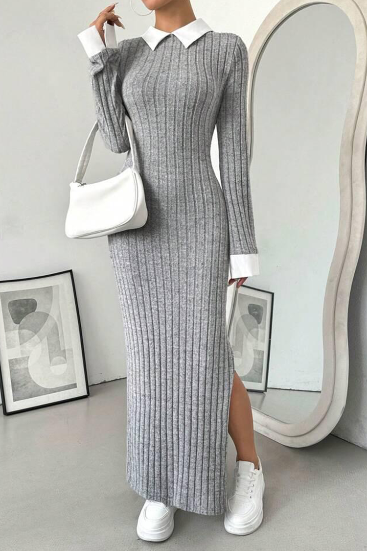 - Modelul are o croială mulată, mâneci lungi, un model în culoare uni, o crăpătură sexy și un guler alb spectaculos.