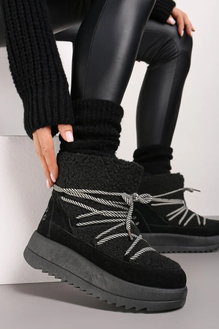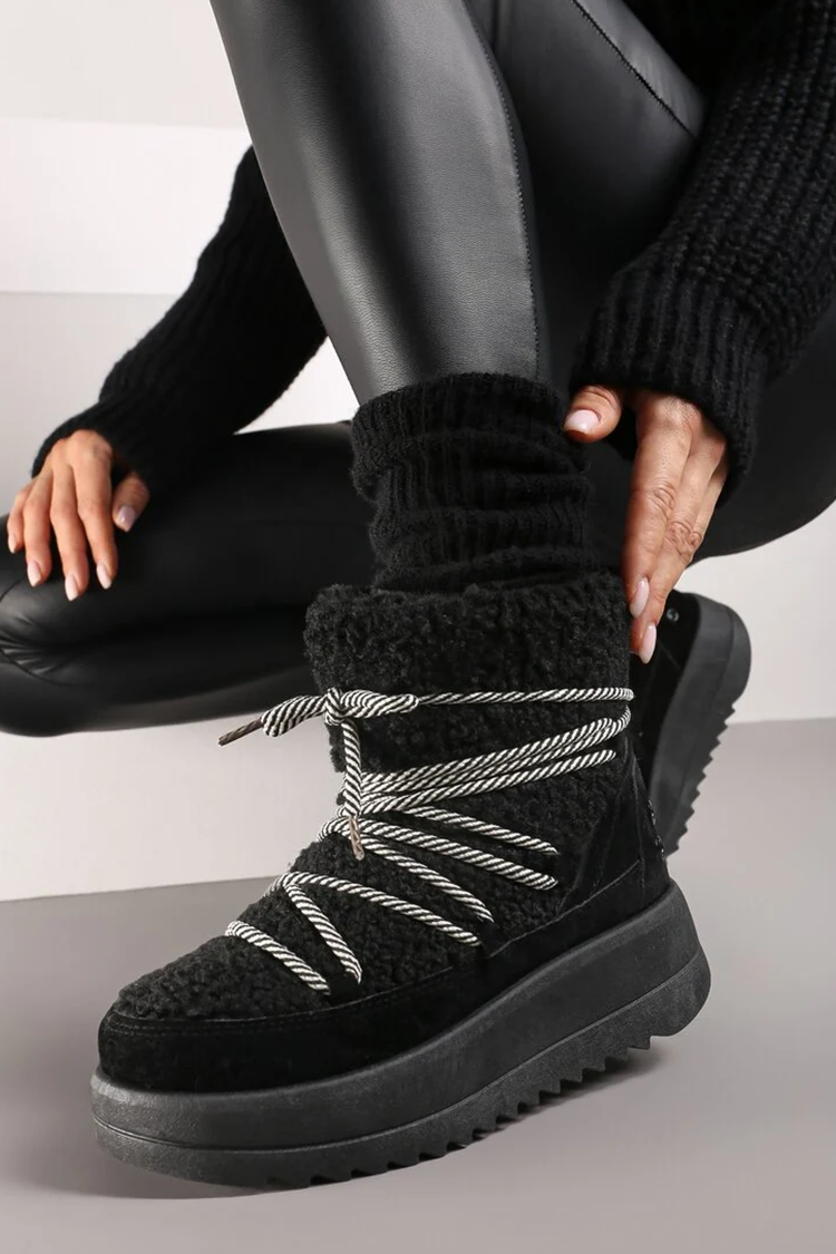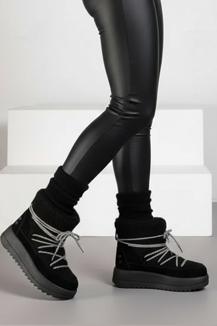 - Apreschiuri calde de dama confecționate din țesătură impermeabilă, decorate cu blană ecologică pufoasă de culoare neagra.